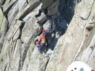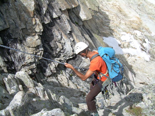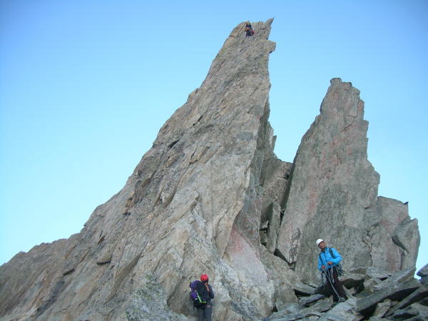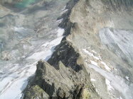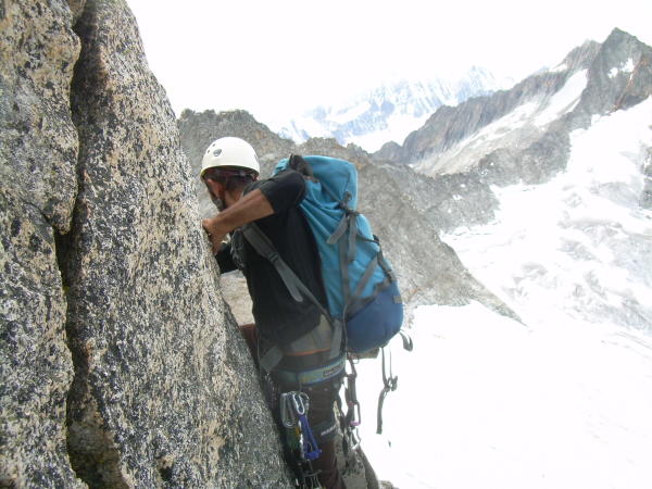 Gute Verhältnisse: trockener Fels, ganztags stabiles Wetter. Der Gletscher ist nahezu komplett aper. Pickel und Steigeisen nötig.
