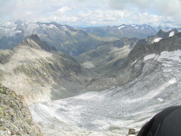 Meistens wird für den Abstieg der Bächligletscher komplett gequert. Wir sind an dessen oberen Rand bis knapp unter den Einstieg zum Ostgrat zurückgekehrt und danach, in etwa dem Aufstieg entsprechend, am schuttbedeckten Randbereich des Gletschers in Richtung Bächlital abgestiegen.