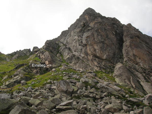 Die ersten 3. SL eigenen sich sehr gut auch für noch nicht 100%ige 5b-Kletterer, weil man gut links oder rechts aussteigen kann. Nach dem alten Einstieg wird es dann schnell alpin und sportlich, dort sind schon 5c nötig. Danke noch an Hüttenwart Michel Anrig, der uns freundlicherweise ein Foto mit dem Topo gemailt hat.