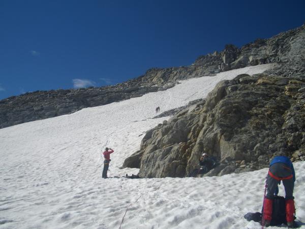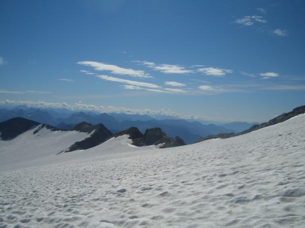 Bei herrlichem Bergwetter den Gipfel erreicht, tolle Aussicht rundherum, Gletscher hat wenige Spalten wird aber früh sulzig wegen Ausrichtung.