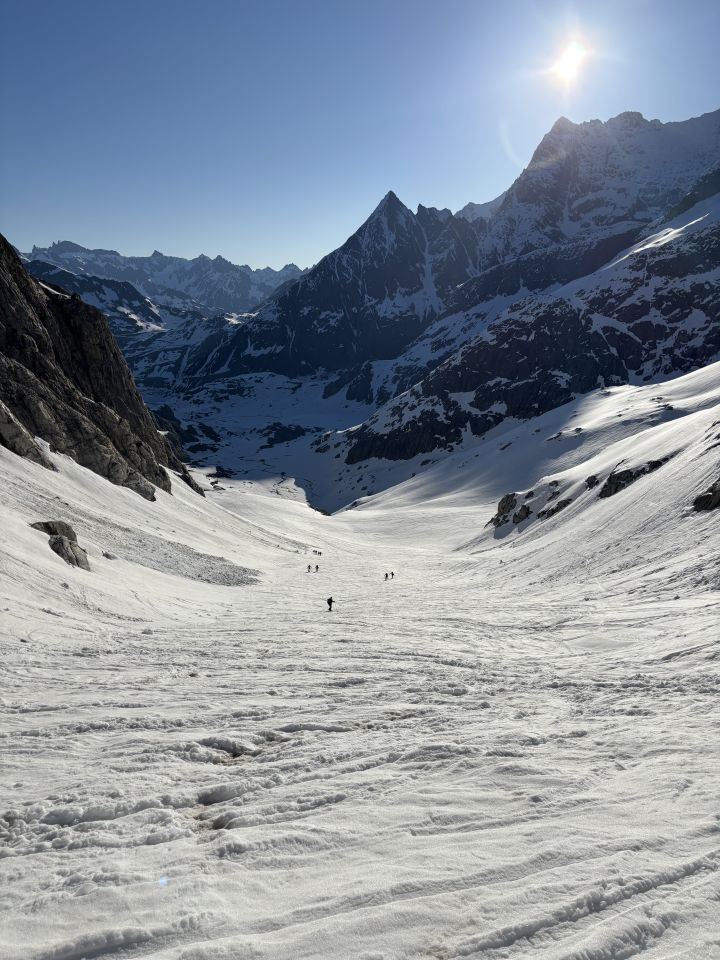 Heute war der Parkplatz Steisee (ca. 1'950m) mit dem Auto erreichbar. Daher Start dort um 06:15 h auf ziemlich gefrorener Unterlage. Die Steilstufe über dem Steimlimi-Gletscher ist eingeschneit und war heute um ca. 08:15 h ohne Steigeisen gut passierbar - wir haben ein paar Tritte reingeschlagen.