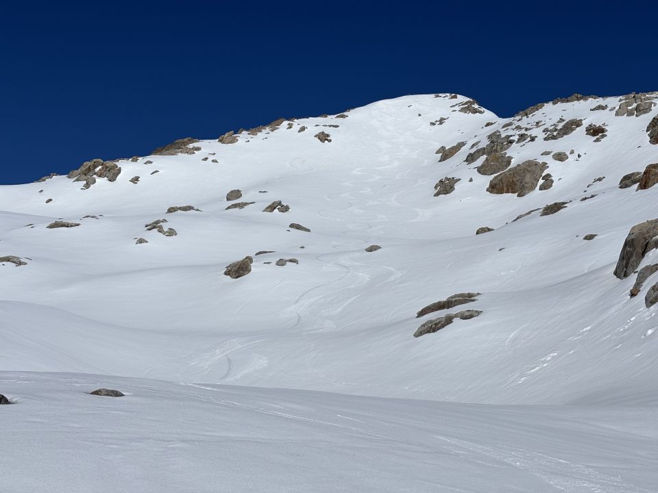 Auf dem Gipfel war es heute windstill, wir haben für die Abfahrt die Variante südlich des Brunnestocks gewählt, was eine gute Idee war: Start Abfahrt um 09:30 Uhr, was sich als idealer Moment herausstellte: Super-Sulz im oberen Teil - was für eine Pracht! Am SE-Hang des Brunnestocks gibt's einige Lawinenkegel, die relativ einfach durchquert werden können (siehe Fotos).