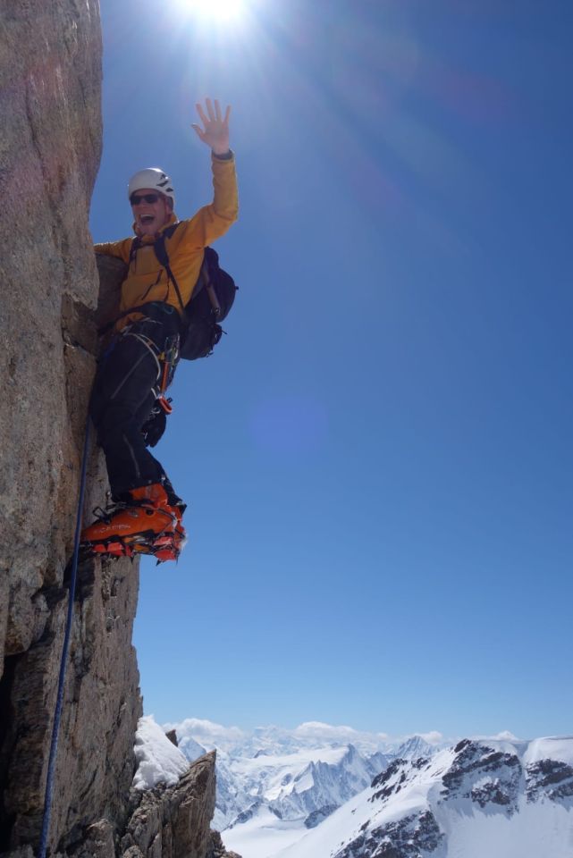 Kann kaum besser sein! Problemlos auf tragenden Hartschnee bis P3630, mit Harscheisen bis 3750 m, Skidepot unterhalb des ersten Schrunds. Mit Steigeisen in klebrig-pulvrigen Schnee bis in die Scharte. Fels am Grat aper, schön zu klettern. Pulvriger Schnee dort, wo man in der Ostflanke Schwierigkeiten ausweicht.