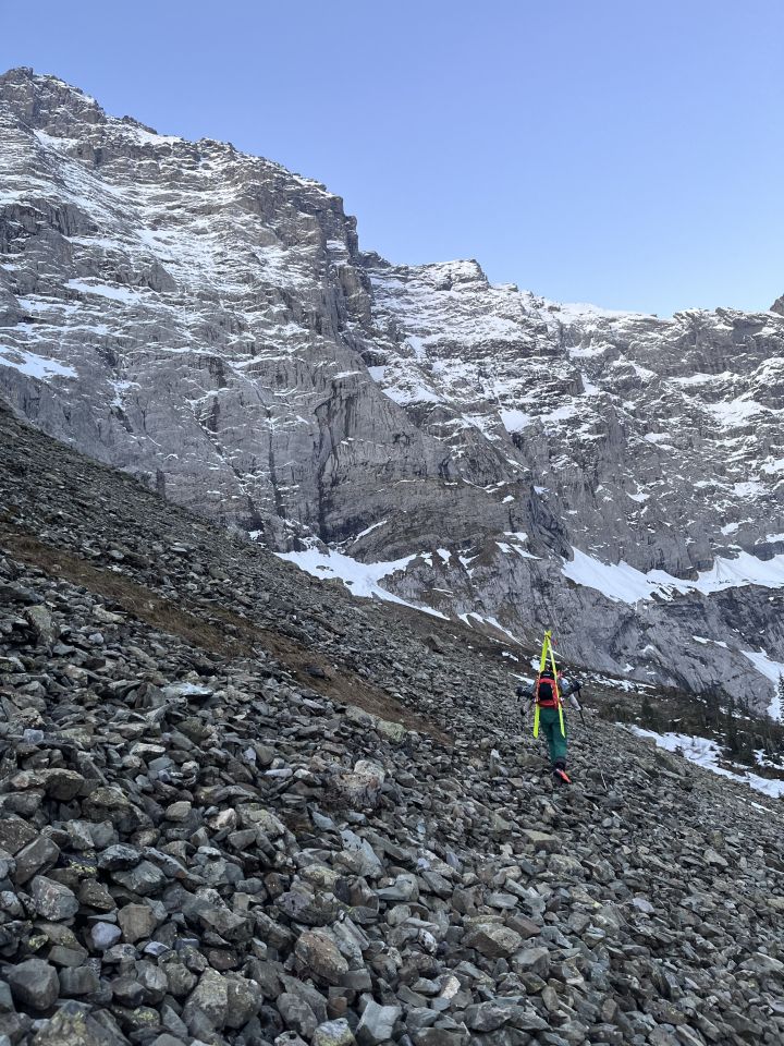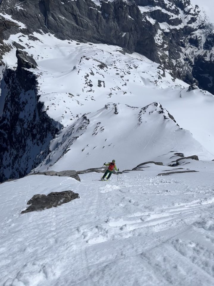 Mann kann gut bis Punkt 2842 m mit Ski un Felle gehen. Das oberstes Teil haben wir beständen direkt von Ost. Mann sollte nur kurz (10 hm) durch Felsen klettern, sonst immer Bootpacking im Schnee. Grat und Kletterei heute unproblematisch.