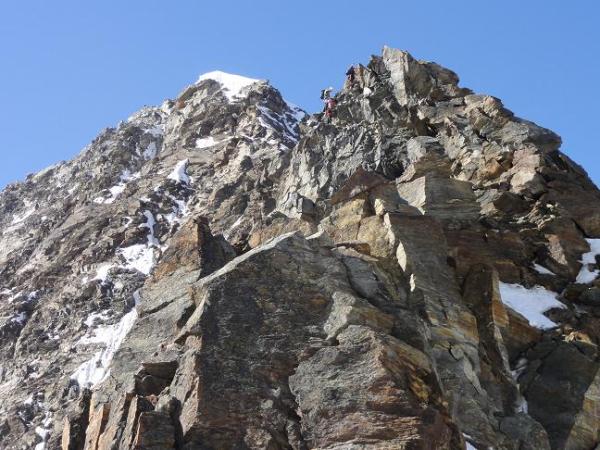 Kletterei machten wir als eine der wenigen Seilschaften in Steigeisen. Die harten Schneepassagen gingen so gäbig und vor dem Gipfel muss man nicht in abschüssigem Gelände die Steigeisen anziehen.