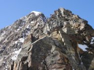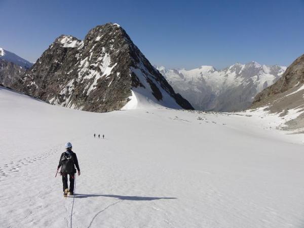 Letzter Bitz vor dem Biwak recht mühsam zu gehen (Steigeisen) da der Gletscher beinahe blank ist. Zuvor ein paar heikle Bachquerungen. Aufgrund der Temperaturen hörten wir die ganze Nacht Steinschlag aus der Nordwand und von der Senggchuppa.