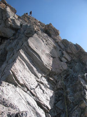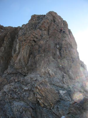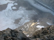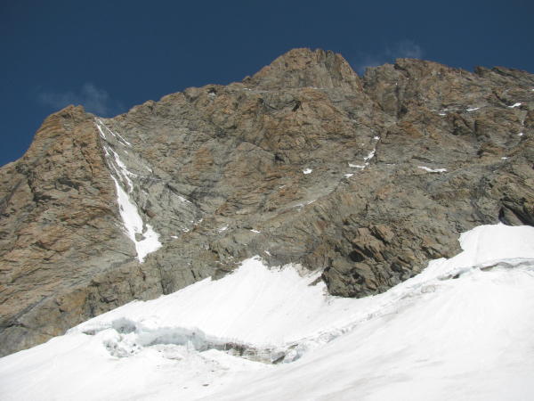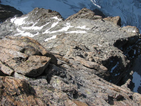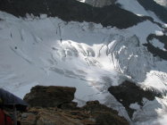 Schrund könnte bei Einbruch der momentan noch knapp vorhandenen Passage schwieriger zu passieren sein ; mit 60m-Seil konnten wir sehr effizient abseilen mit überspringen von Ständen - jedoch: achtung Seilklemmer...) empfohlen sind jedoch 40m ; ausser Abseilstellen sind keine Sicherungen angebracht, es kann jedoch im festen Gneis fast überall gut mit Materialeinsatz bei Bedarf gesichert werden.
