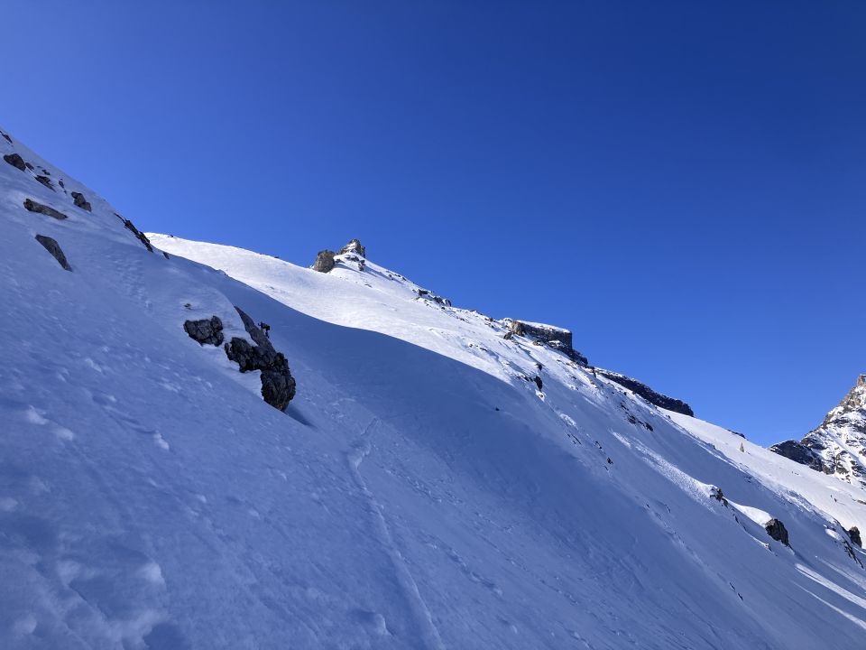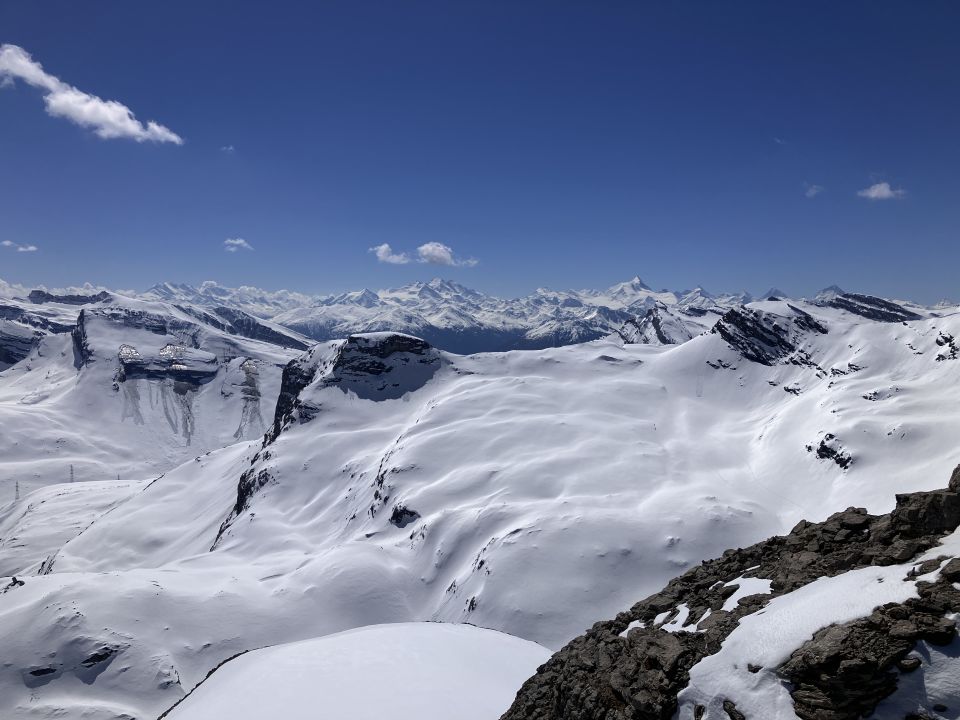 Aufstieg ab Bergstation Skilift Engstligenalp bretthart, aber mit Harsteisen gut zu gehen. Gipfelanstieg so gut wie aper, Abfahrt schöner Butterfirn. Weiter über Rote Totz Lücke zur Lämmerenhütte unproblematisch, durchgehend guter Schnee.