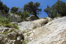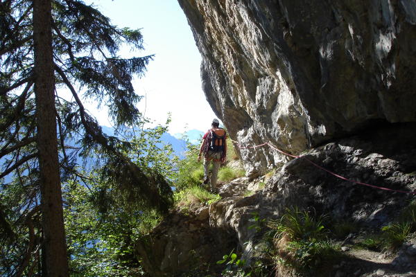 Zustieg ab Alp Egg nach dem Wald auf einem Felsband dann Senkrecht hoch auf Eisenbügel.