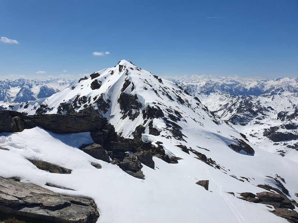 Unterhalb der Felsen westlich vom Grat habe ich noch ein wenig Schnee für einen Skigipfelaufstieg ausmachen können. Über viele Lawinenabgänge ging es sehr steil (kurz 40°) aber auf knapp gut tragendem Sulzschnee hoch zum W-Grat (Achtung vor der kleinen Wechte) und weiter in ein paar Meter einfach zum Hauptgipfel des Piz Blaisch Lunga. Er ist nur 6 Meter höher wie der S-Gipfel, doch für die Rundumsicht machten diese paar Meter wirklich etwas aus.