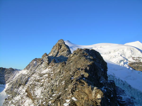 Wie gewohnt, zog das Gros der Bergsteiger von der Diavolezza aus gen Palü. Am Cambrena war, außer uns, nur noch ein Pärchen aus Davos unterwegs. Erst zum Schluss, als wir gerade mit dem Abseilen durch die Aufstiegsrinne beschäftigt waren, tauchte, wie aus dem Nichts und im vollen Tempo, eine Zweierseilschaft auf, die genauso schnell auch wieder verschwunden war.