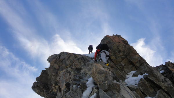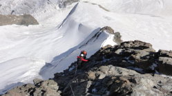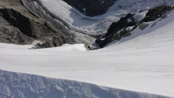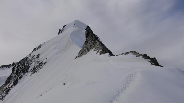 Biancograt sehr gute Spur, Übergang zum Piz Bernina optimal, etwas Schnee stört nicht.