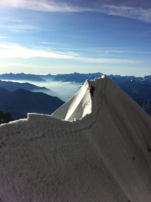 Wir sind über ein gutes Firncouloir oberhalb des Col de la Fourche auf den Grat gestiegen (wird im Snow Ice & Mixed als Alternative aufgeführt.)Starke Ausaperung auf dem Kuffnergrat, blankes Eis oder Fels wo normalerweise Firn oder Mixed. Firn auf dem Gipfelgrat