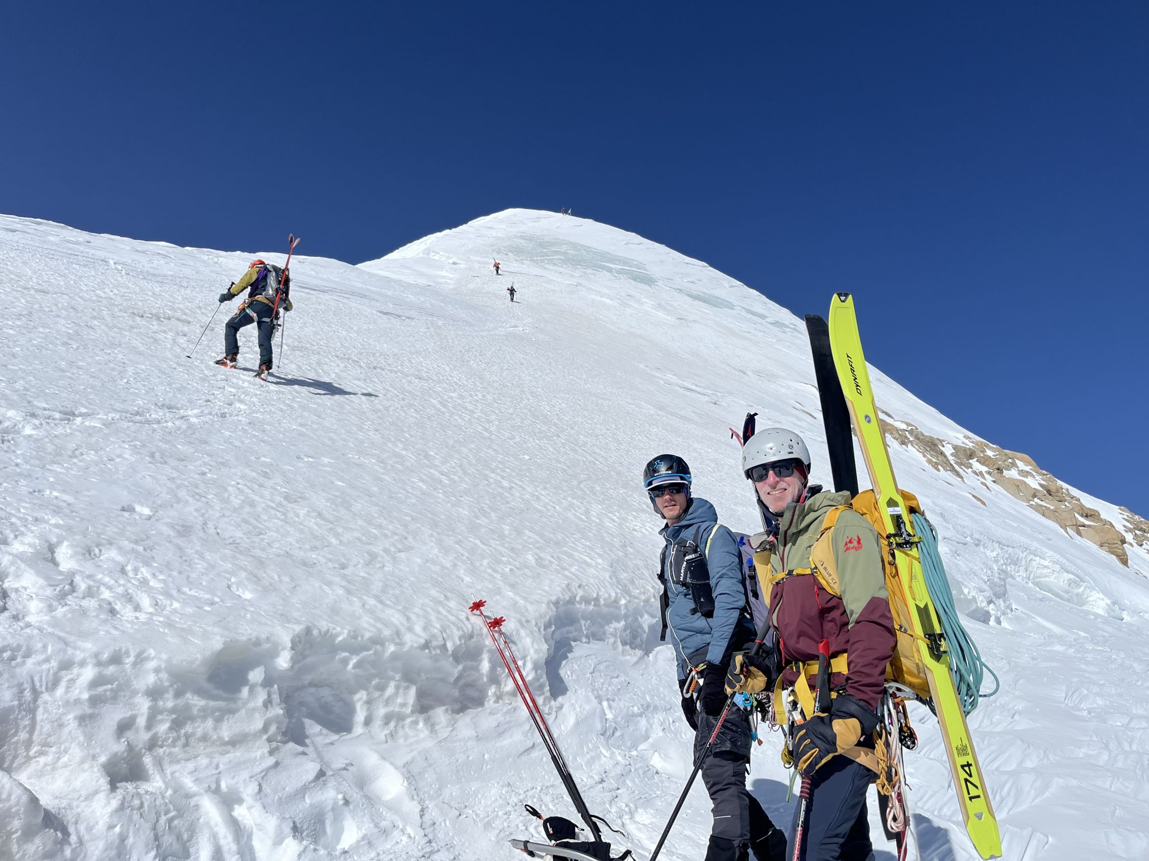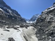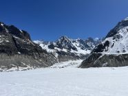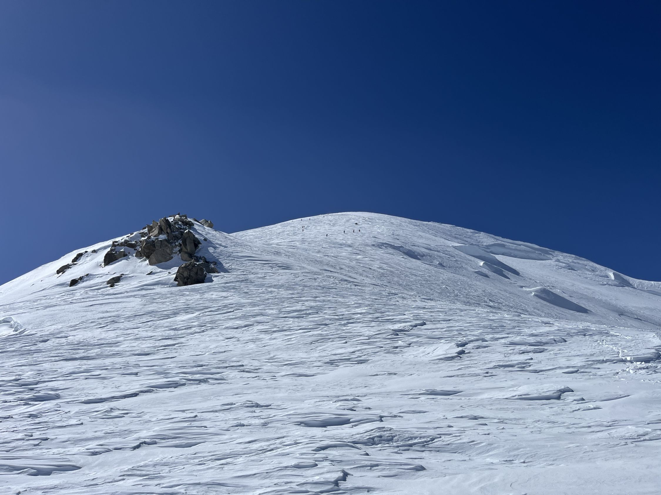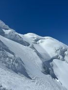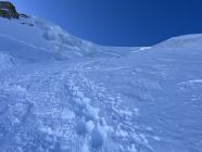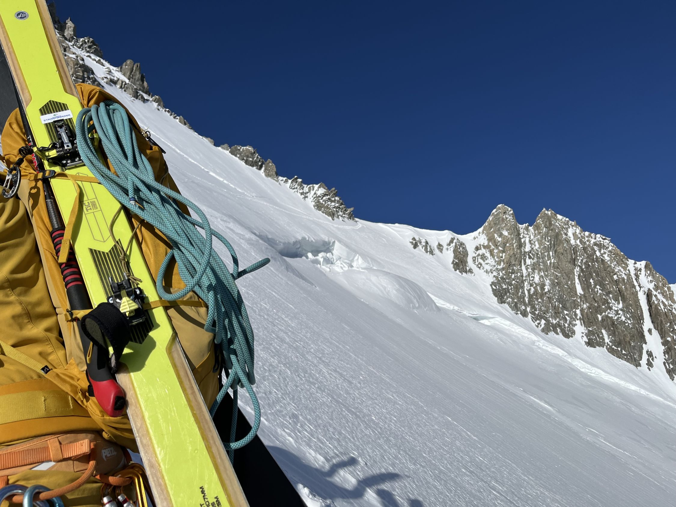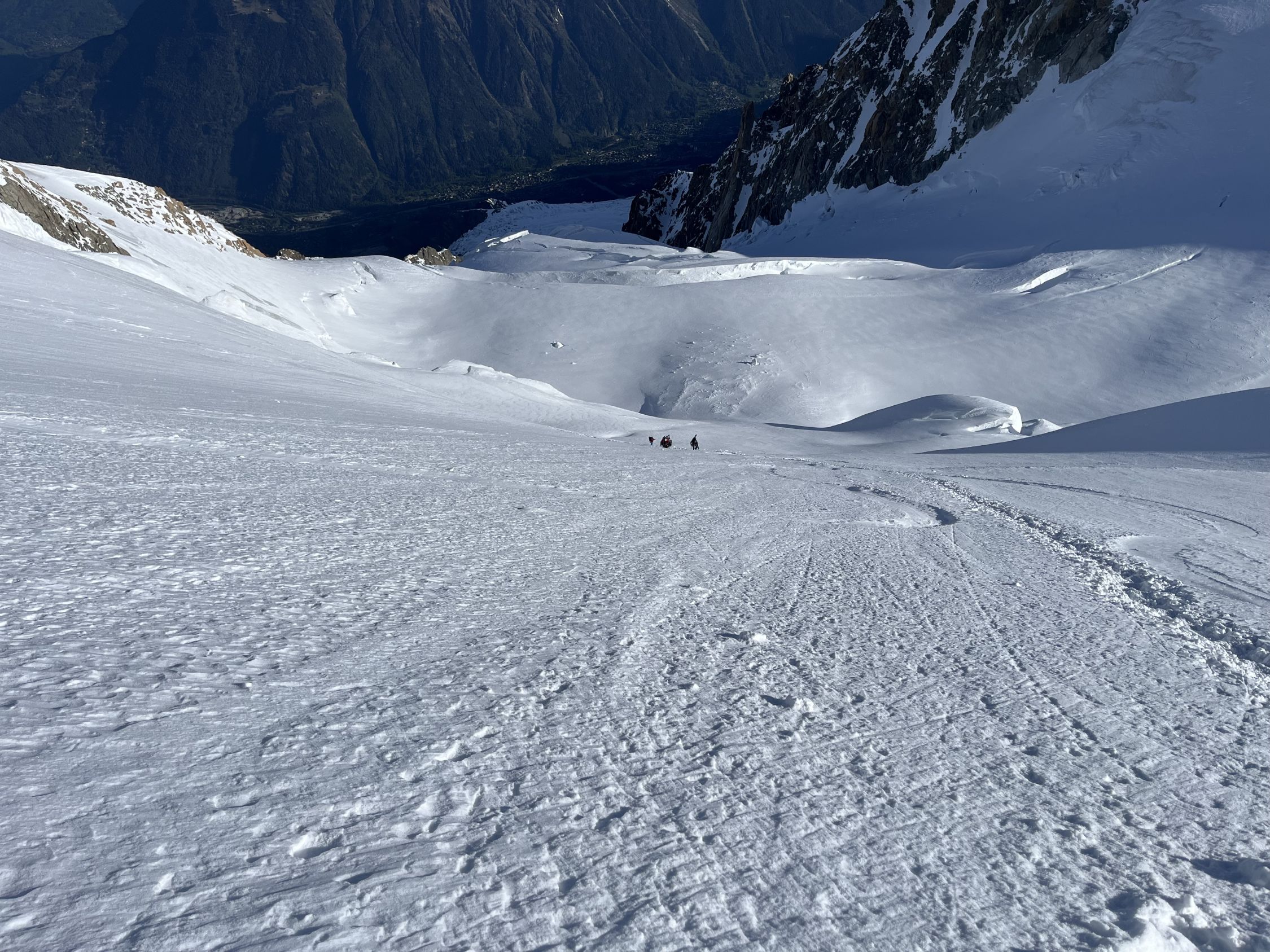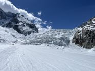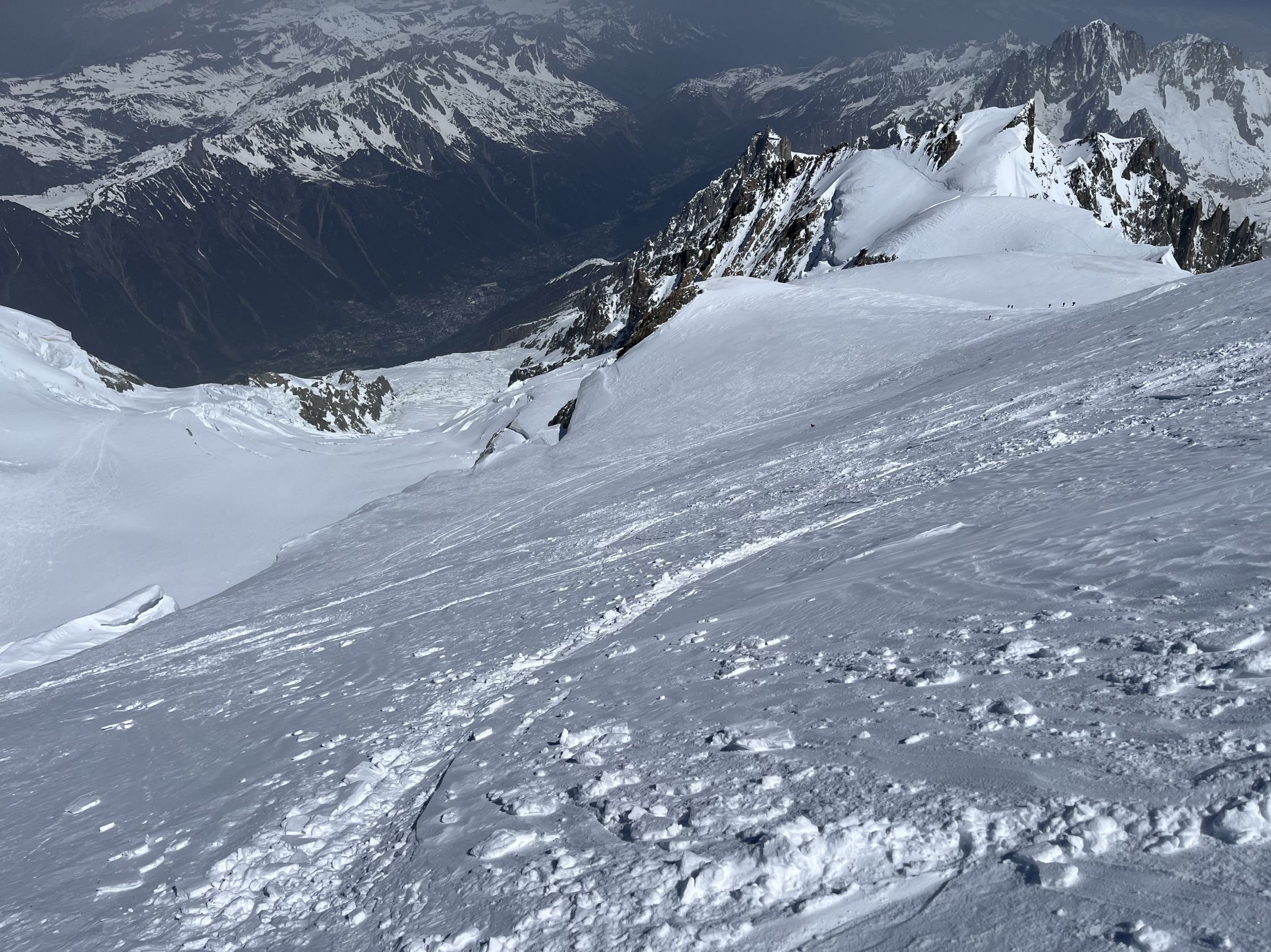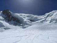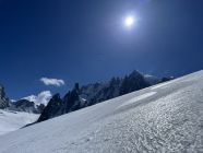 3.Tag Start 4 Uhr, gleicher Weg wie gestern, aber Gipfel Mont Blanc du Tacul liegen gelassen und gleich weiter Richtung Col Maudit, am Bergschrund werden aktuell 2 Eispickel benötigt, in der Flanke 30 cm Pulver und nur 1 Abfahrtsspur (mir blutet das Herz…), aus Zeitgründen nicht zum Gipfel (ca. 1 Stunde zusätzlich), dann endlich Ski an die Füsse und zum Gipfel (wir waren eine der letzten Seilschaften, aber die ersten mit Ski an den Füssen!?), Zeitbedarf 8 Stunden, Abfahrt ca, 150 hm auf dem Aufstiegsweg, dann in die Nordflanke, die ersten 300 hm schönster Pulver und nur 2 Spuren, dann bis zur Plan de L'Aiguille erst immer wieder Pulver, dann Buckelpiste und noch Firn, immer schön zu fahren, ganz am Ende erst Sulz und 2 fiese Gegenanstiege (Abfahrt ca. 2,5 Stunden)