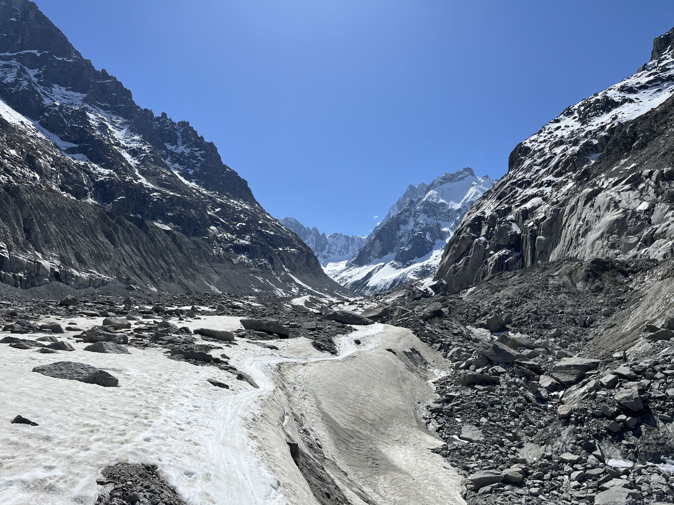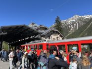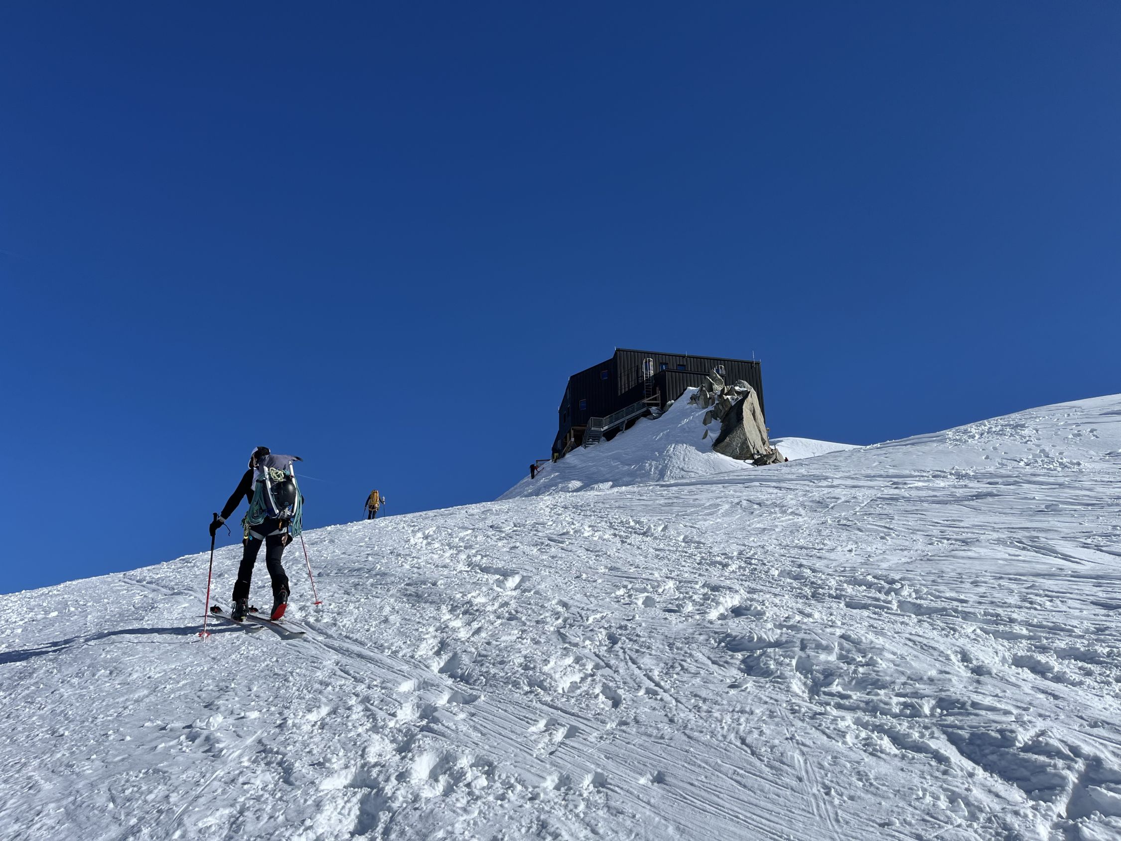 1.Tag Mit der Bahn von Chamonix bis Montenvers, kurz mit der Gondel runter zum Mer de Glace und noch ca. 1/2 Stunde Ski tragen, dann Aufstieg zum zum Rif. Cosmiques