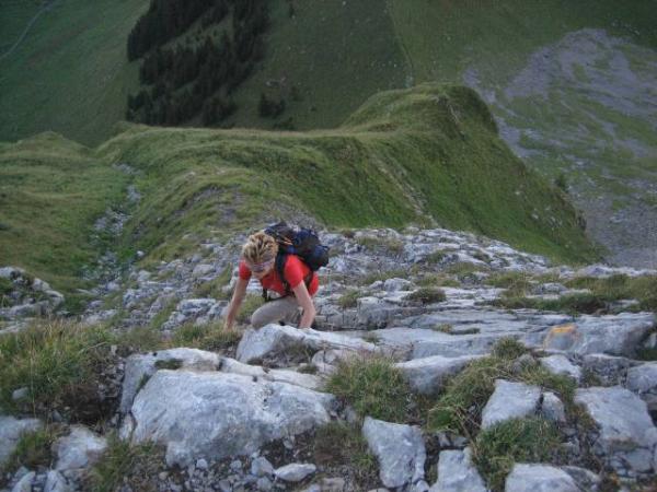 Warmer Spätsommertag. Gras oberhalb der Chammhalde etwas nass, aber ansonsten trockene Verhältnisse. Schöner Aufstieg von der Chammhalde über schrofiges Gelände zum "Großen Band". Ab dort setzt der anspruchsvollste Abschnitt des Aufstiegs ein mit einer "luftigen" Querung in eine Rinne. Man folgt den organgen Markierungen bis zum Hüenerbergsattel, wo wir erstmals Sonnenstrahlen abbekamen. Ausser uns nur 1 Berggänger auf der Route.