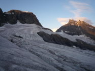 Der Gletscher war noch nicht durchwegs aper, daher war eine vorsichtige Spurwahl nötig. Die Felsen am Westgrat waren schneefrei und trocken.