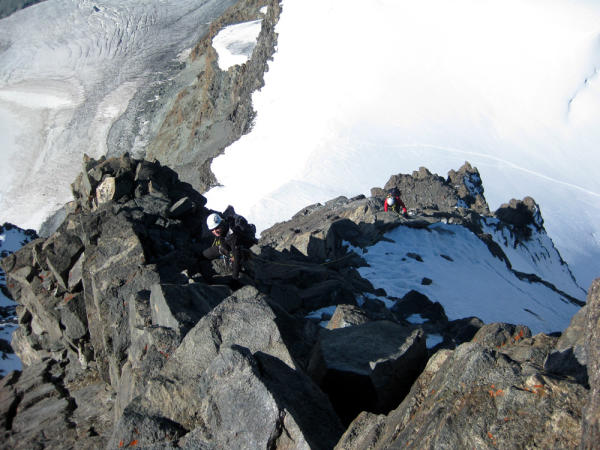 Sehr gute Verhältnisse. Felsen trocken, Firnpassagen ohne Eis.