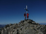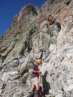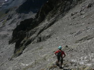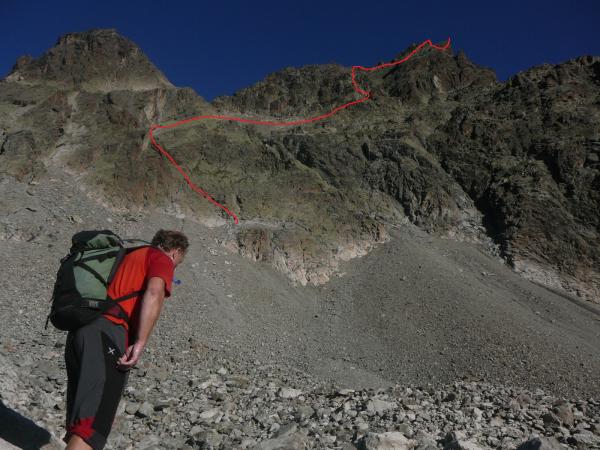 das Gelände auf der Nordostseite des Bergs ist sehr bröselig, der Anstieg über den Südgipfel ist vielleicht etwas schwerer, aber dafür fester Fels;