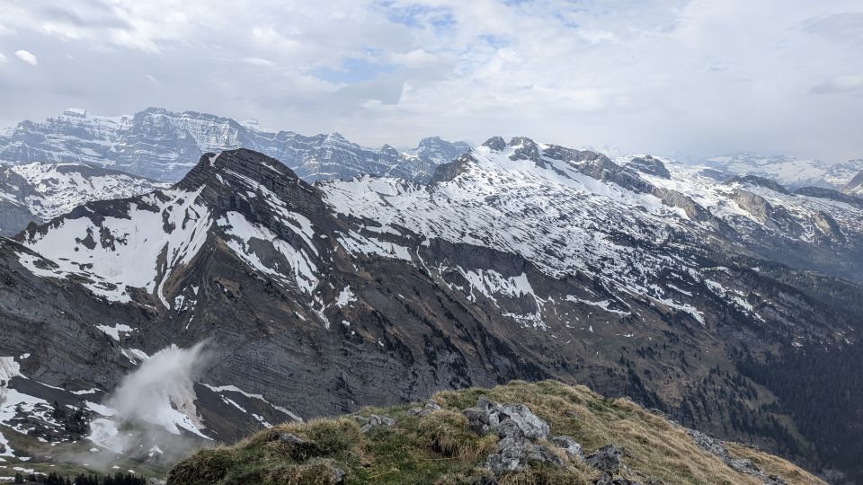 Die Geröllflanke zur Pattenberg-Grasrampe ist dann im Bereich der erdigen Spur mehr nass, das ist etwas unangenehm, da doch überraschend steil, wenn auch mit ausreichender Trittsicherheit nicht problematisch. Die Grasrampe ist dann wieder trockener. Am Gipfel überrascht mich ein erster Regenschauer, so dass ich schneller als gedacht von hier verschwinde.