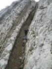 Von den nächtlichen Niederschlägen her noch etwas feucht im Kamin, vorzugsweise an den Schlüsselstellen ;-). Der Säntisführer von 1974 bewertete den Aufstieg durch´s Schaffhauser Kamin noch mit Kletterschwierigkeit I, was nach heutigen Maßstäben völlig unhaltbar ist. Die inzwischen recht abgeschmirgelte Schlüsselstelle zu Beginn der Kletterei ist mit ein paar Schlingen versehen, an denen man sich emporziehen kann. Frei geklettert wäre das aber ein IIIer.