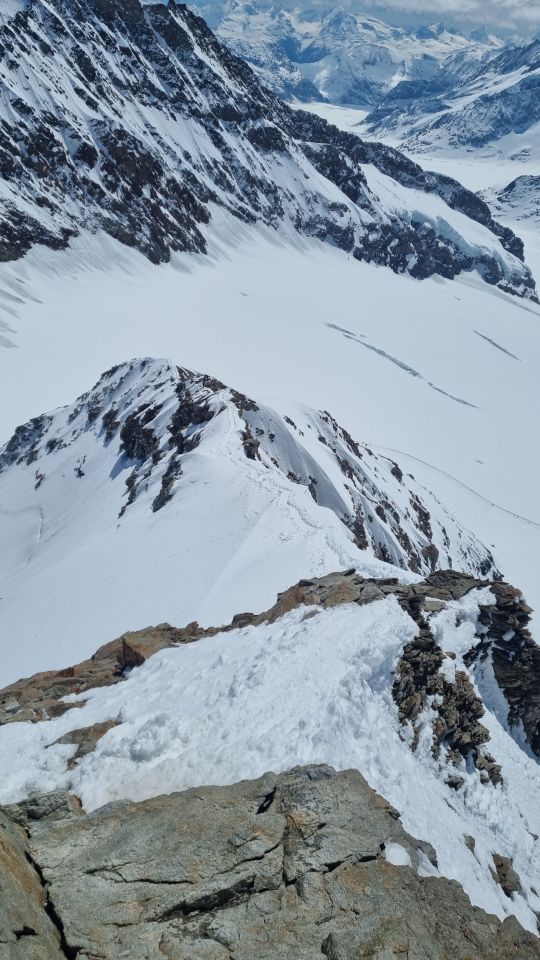 Gute Spur von unten bis oben. Gipfelgrat einfach und breit. Den Einstieg wählten wir links durch die Schneeflanke, was gut ging. Im Abstieg war der Schnee auf den Platten dermassen nass, dass wir es vorzogen, über die Felsen abzuseilen.