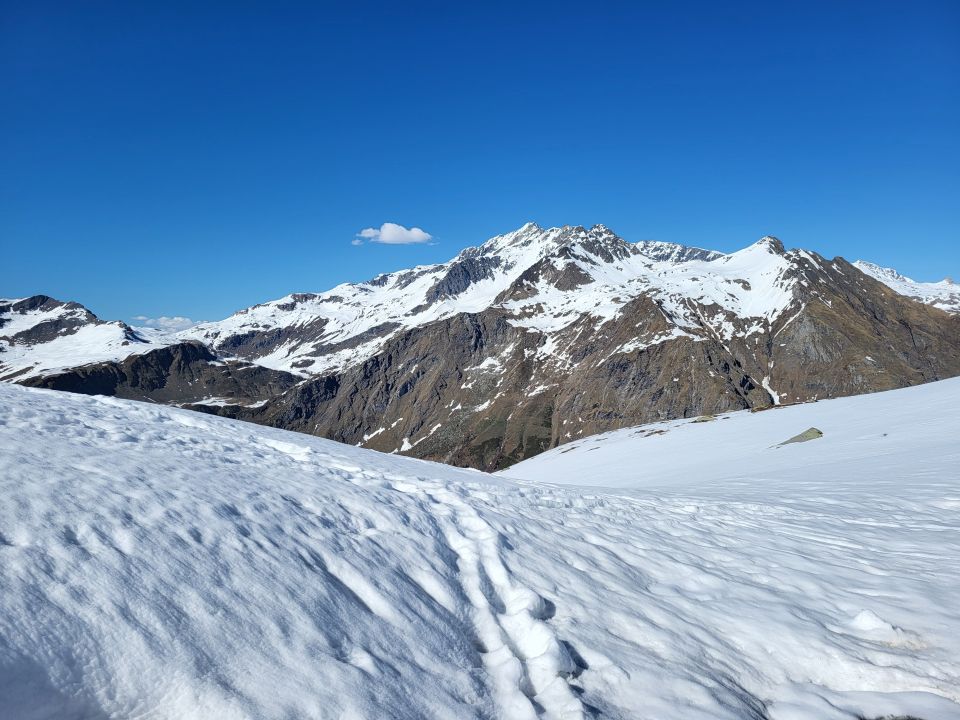 Abfahrt über den steilen Gletscher gut. Nach dem Col schön aufgefirnt bis auf ca. 2100. Mühsam weich bis auf ca. 1900 und dann auf dem Sommerweg zum PP.