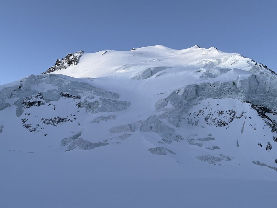 Bis Pt 2436 Ski getragen, danach Querung im Schnee und Aufstieg fast durchgängig mit Ski bis zum Dom. Oben Pulverschnee, letzter Gipfelanstieg mit Steigeisen.
