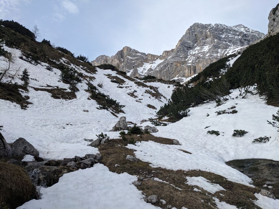 Schlauchkar oben tiefweiß, Schneegrenze auf Höhe des Karwendelhauses (mit MTB erreichbar im Gegenteil zu letzter Woche).