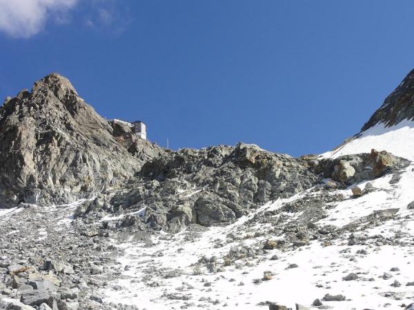 Von der Bertolhütte zur Schulter bei Pkt. 3373 muss ein steiler Schutthang überwunden werden. Dieser ist auf der Karte kaum ersichtlich und auch in den Beschreibungen nur spärlich erwähnt. Es lohnt sich den Beginn bis auf den feinschottrigen Teil am Vorabend aus der Nähe zu betrachten, denn wir fanden keine Markierungen und keine Steinmännchen vor. Die Route ist nun mit Steinmännchen markiert bis dort wo man auf die Wegspuren trifft. Erwischt man die ideale Linie muss vom Gletscher bis auf die Schulter nirgends geklettert werden (Fixseile werden links liegen gelassen).