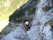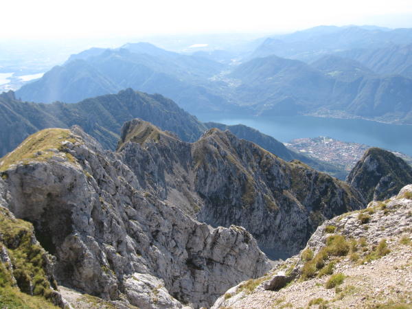 Von dort wird abgestiegen mit Hilfe einer Kette und dann gleich wieder auf der Gegenseite 30m hinauf, (Klammern/Kette). Die Ferrata wird zum Gratweg mit gesicherten Passagen, diese Route unterschätzten wir, sie ist anspruchsvoller und länger als wie wir nach Studieren eines Führers erwarteten. Der gesamte Grat verlangt Trittsicherheit, ist bei Nässe abzuraten und im Abstieg nichts für schwache Nerven. Am besten genießt man das große Panorama erst am Gipfel und bleibt am Weg konzentriert. Die Sicherungen sind überwiegend in gutem Zustand, manchmal sind Zwischenhaken ausgerissen, meiner Meinung nach verlaufen viel zu viele Meter der Ketten an nur einer oder zwei Sicherungen, bei viel Betrieb gibts da ordentlich Gewicht drauf. Man vertraut oft besser dem Fels und belastet die Ketten nicht übermäßig. Es gibt auf der Route herrliche Rastplätze, wir entdeckten sogar Edelweiss. Unterhalb des Gipfels befindet sich das Rifugio Brioschi in einmaliger Lage, auch hier ist der Getränkekonsum nur aus dem Rucksack zu holen, also wochentags zu. Vom Gipfel genießt man ein großes Panorama vom Alpenhauptkamm über die Poebene bis zum Apennin und immer wieder die Tiefblicke zum Comer See.