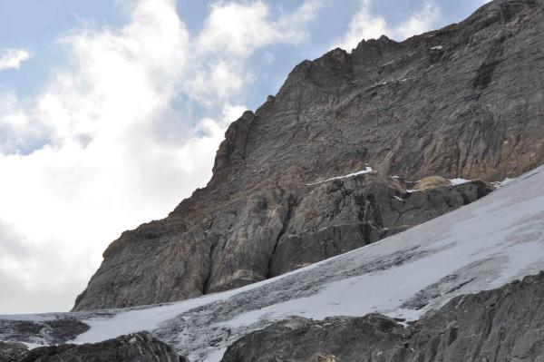 abstieg zum rothornsattel, fels trocken und wenig schnee vorhanden.