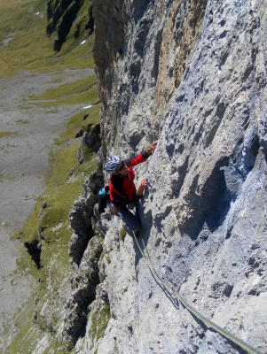 Ist wirklich eine super Tour. Vom Anspruch her fand ich im Nachstieg die 4. SL (6c+) am schwersten, hier muss man schwierige Züge teils mehrere Meter nach dem Bohrhaken machen, zudem hat es zwischen dem zweitletzten und dem letzten Bohrhaken ein deftiger 8 Meter Runout in doch immer noch anhaltendem 6a+ - Gelände, der mit einem eher wackligen Friend nur teilweise entschärft werden kann. Die oberen beiden 7a's sind im Vergleich deutlich gutmütiger.
