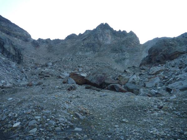 Bis auf den Gipfel kein Schnee mehr. Gh. d'Arbola blank, kann aber wie in der Routenbeschreibung beschrieben, unterhalb umgangen werden. Abstieg links des Nordostgrates in hartem Firn (Steigeisen unabdingbar). Steilstufe oberhalb und über den Schrund blank. Gletscher bis Hohsandjoch mit wenig Schnee bedeckt. Die wenigen, kleinen Spalten sind sichtbar. Aus der linken Seite des Hohsandjochs haben sich grosse Felsblöcke gelöst, die jedoch in die Spaltenzone (siehe Bild) gefallen sind. Auf der Tour empfiehlt sich ein Helm mitzunehmen, insbesondere für den südlichen Teil. Gletscher ab Hohsandjoch aper und gut begehbar.