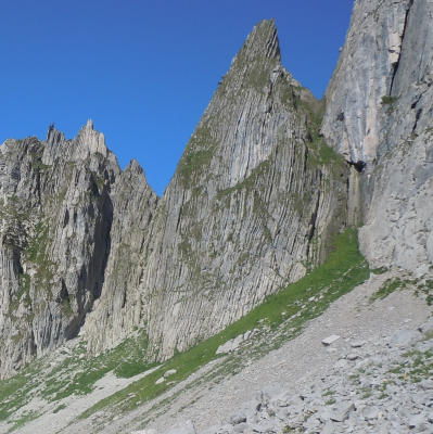 Obwohl "Anfängerkletterei" genannt, bietet diese Tour alles einer grossen alpinen Klettertour im kleinen Rahmen: Heikle Zustiege, steile Zacken, schattige Scharten, sonnige Wände, luftige Kanten und ein Gipfelkreuz.
