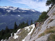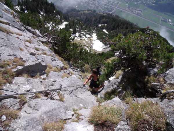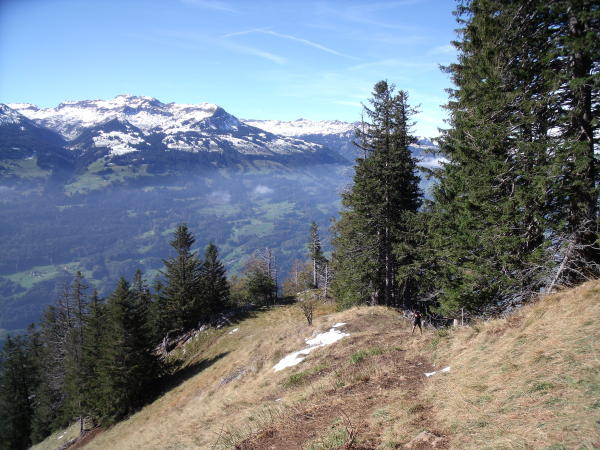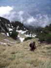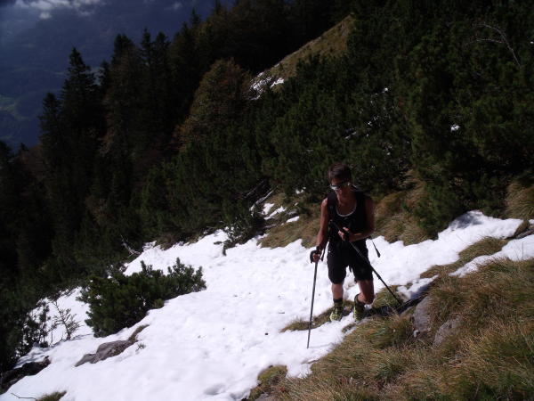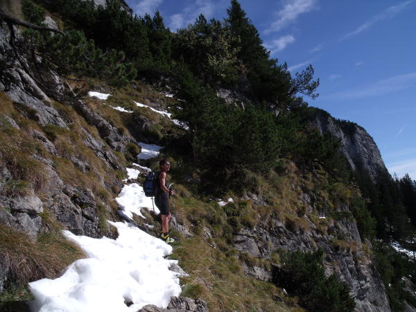 In den Rinnen hat es teilweise Schneereste. Der Rückweg führte uns über Palfries zur Hinteren Spina und dann durch die Klus hinunter nach Heiligkreuz. Der Bereich Palfries liegt im Schnee und ist nass bis sumpfig. Die Südseite ist wiederum trocken und normal begehbar.