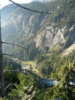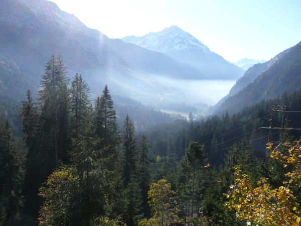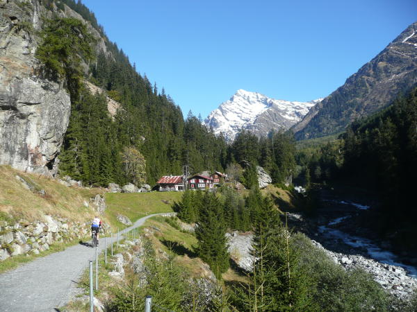 Amsteg-Golzernsee-SAC Hotel Madranertal (Geheimtipp) Wir starten in Amsteg-Golzernbahn. An diesem frühen Oktobertag ist der Aufstieg nach Bristen und weiter ins Maderanertal sehr kühl. Zum Glück haben wir warme Kleider dabei, die wir schon bald entledigen können und oben bei Sonnenschein in unser geniales Rucksacktransportsystem(www.genial-biken.ch)verstauen können.