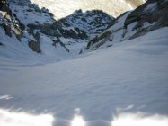 Im Abstiegs-Couloir lag eine beachtliche z.T. harte Schneeschicht. Man konnte jedoch meistens gute Tritte legen. Ein Eispickel wäre aber kein Luxus gewesen.