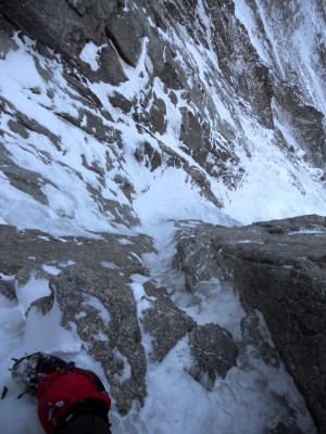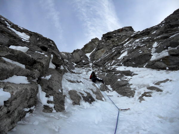 Ab der Goulotte zur Pfeilerscharte bis zum Ausstieg zwar immer noch gutes, aber nur knapp Eis. Daher anspruchsvolle Mixed-Kletterei (M6+ ??) vor dem Crozturm und vor allem um die erst nur schwach vereiste Ausstiegsrinne zu gewinnen. Dort auch nur mässig bis schlechte Absicherung im Fels möglich.