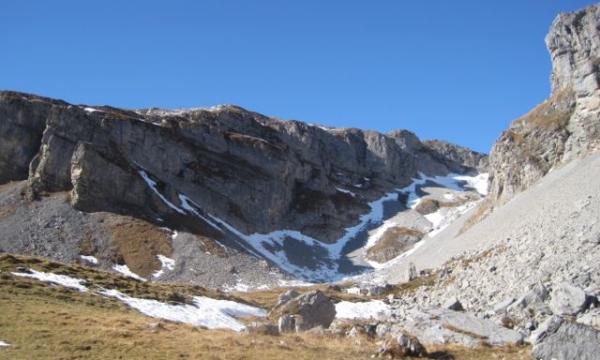 Südhänge trocken und schneefrei; einige Hartschneeflecken in den Nordhängen unterhalb des Gipfels, die aber gut umgangen werden können.