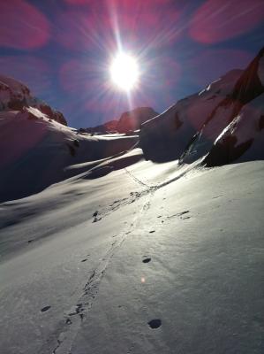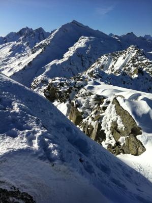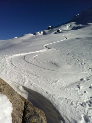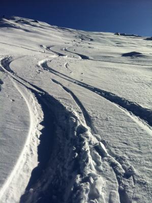 Vom Gipfel bis in die Mulde zwischen Fibbia und Pizzo della Valletta (P.2386) gut gesetzter Pulverschnee vom Feinsten.