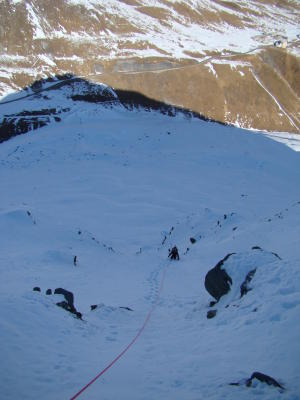 Besser ein 45m Seil fuer den Blauberg, wir mussten unser 30m Seil mit Schlingen verlaengern um den Nachsteiger vernuenftig zu sichern.
