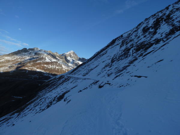 Couloir, wegen der steilsten Stelle besser mit Steigeisen. Grösstenteils guter Trittschnee.