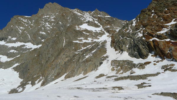 Randmoräne des Strahlegggletschers teils schneefrei, teils guter Firn. Südwandcouloir von anfang bis Ausstieg auf P.3915 guter, aber sehr harter Firn, geht ordentlich in die Waden. Gipfelgrat nahezu schneefrei. T-Shirt Wetter auf dem Gipfel.