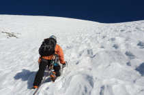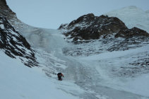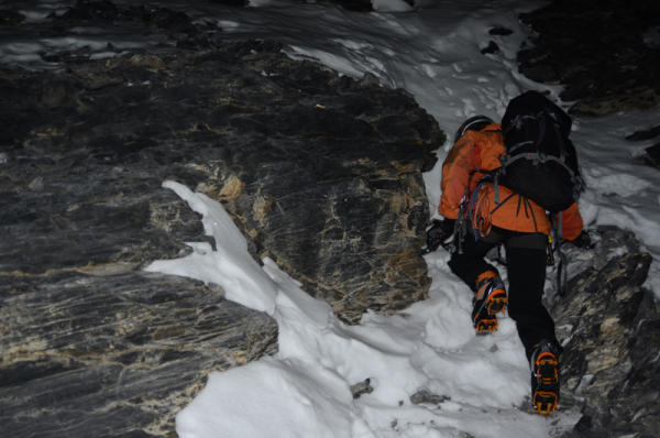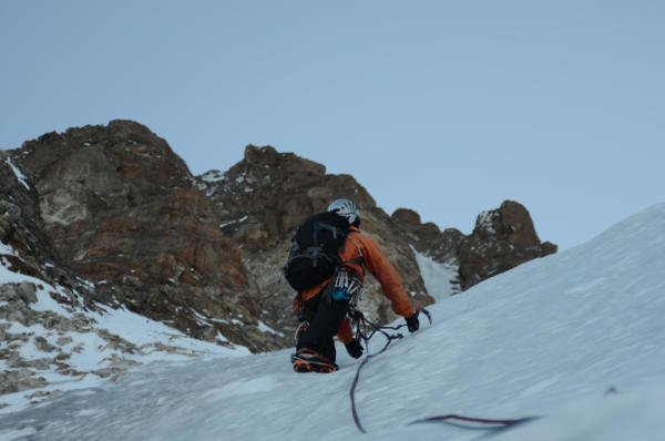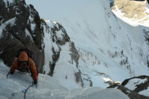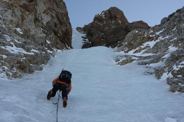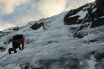 Gut kletterbar, aber anstrengend. Viel betonhartes Blankeis, was vor allem den Eisfall schwerer macht als von der Steilheit her angemessen (hart 5). Zweite Crux in der zweiten Länge an kurzer senkrechter Felsstufe: hoch steigen und strecken, um die Geräte in die Eisplatten zu platzieren, dann ein hoher Schritt (WI 4-5). Längere Strecken auch mit angenehm stapfbarem Schnee, teils ist die Schneeauflage auf dem harten Blankeis aber auch nur dünn. Kurze Schrauben gelegentlich noch zu kurz. Gute Spur im Zustieg und im Abstieg vom Gipfel.