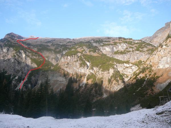 Steigspuren meist nur schwach erkennbar, Markierungen Fehlanzeige. man muss sich schon im Aufstieg markantere Punkte merken, um dann im Abstieg die richtigen Rinnen wieder zu finden.