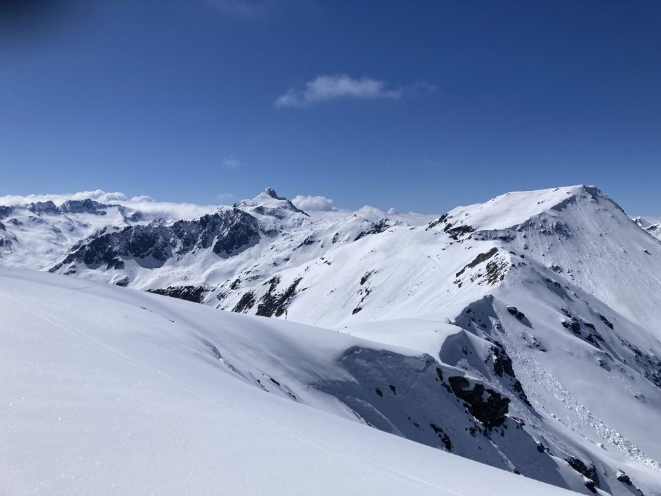 Abfahrt via Nurschalas Gondas zu Pt. 2079. Es hat dort auf 2241 ein aper werdendes Stück Ich stieg hier für 50hm zu Fuss ab