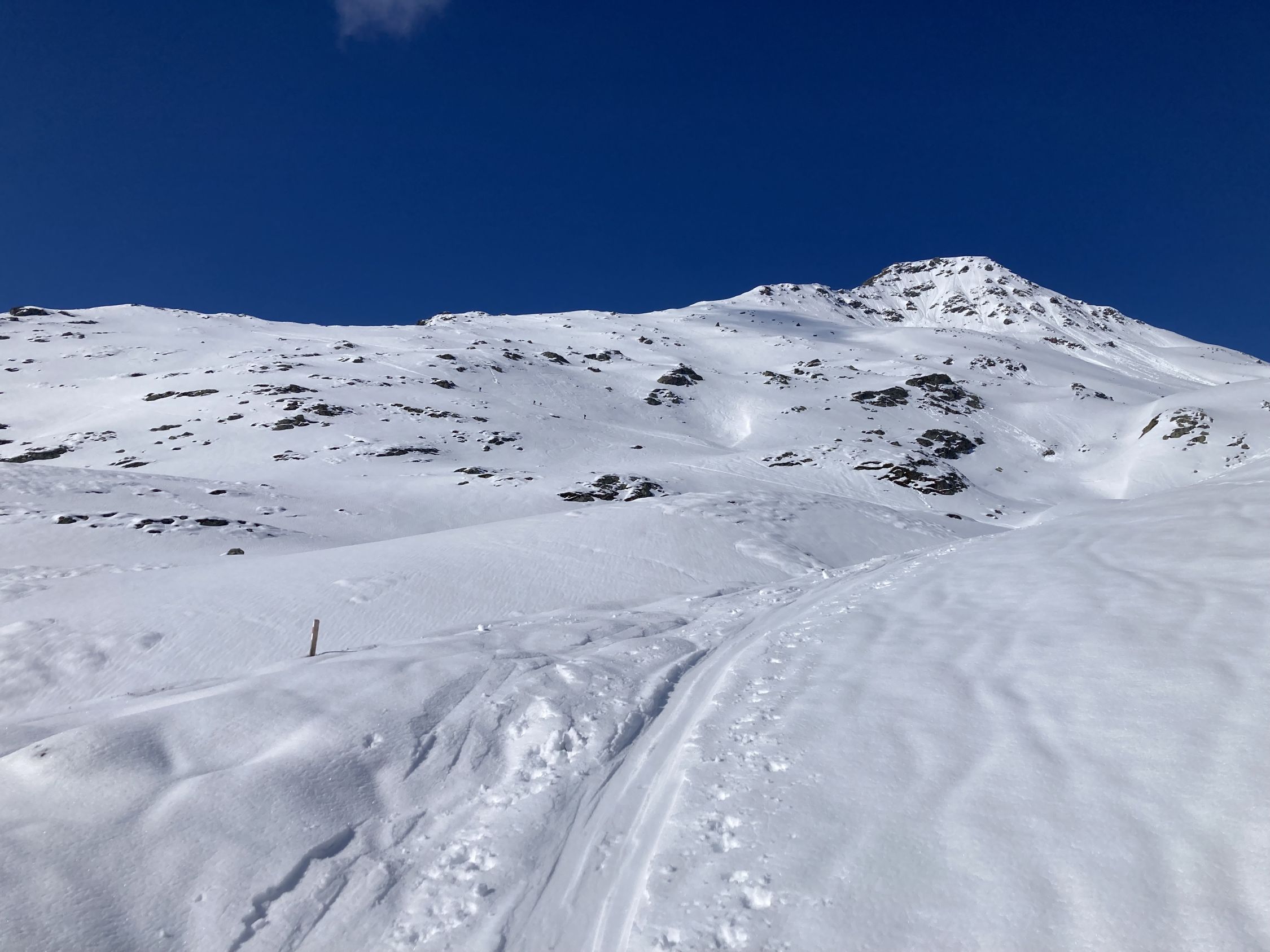 Eine einsame Schneeschuhspur ab Pt. 2079 in Richtung Maighelshütte.