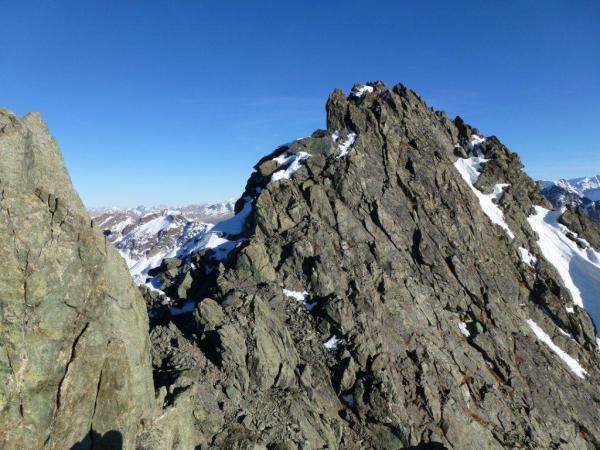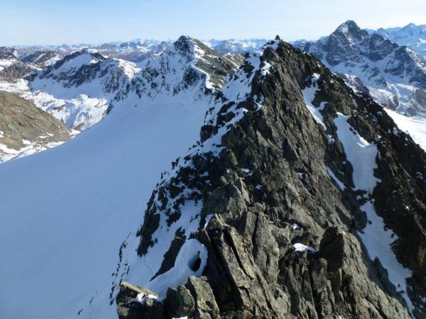 von La Vedutta zur Fuorcla d'Agnel fast kein Schnee, vom Piz Surgonda zu la Vedutta Gamaschen von Vorteil.Fels knochen trocken.