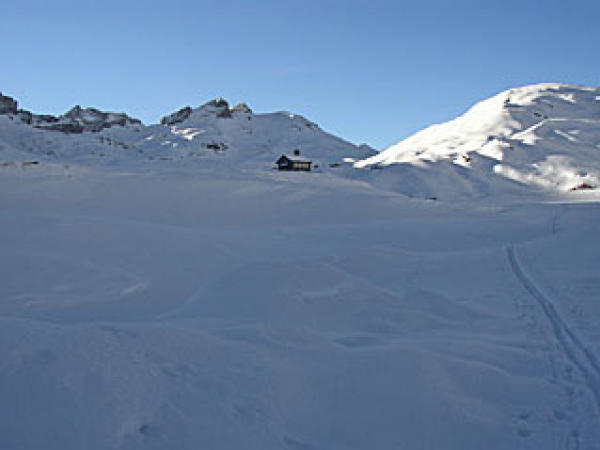 An exponierten stellen bis auf's Gras abgeblasen. Sonst genügend Schnee, so dass Abfahrt ohne Belagschäden gemacht werden kann.